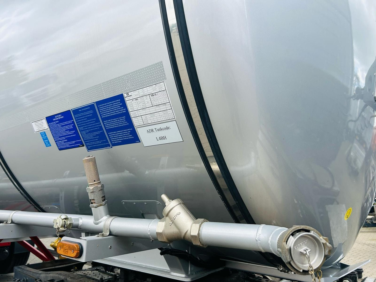 * Auslaufleitung Gemäß der Norm EN14433, Auslaufleitung beginnend mit 4" Bodenventil mit Handradsteuerung und führt zur sicherem Entladen eine 2. S icherheitsventil (gemäß der Norm EN14432, 4" Absperrklappe mit mech. Steuerung) und endet mit einer 3" TW-Kupplung mit Innengewin de und Blinddeckel. Zwischen der Absperrklappe und TW-Kupplung ist ein 1/2" Probeentnahmehahn enthalten.