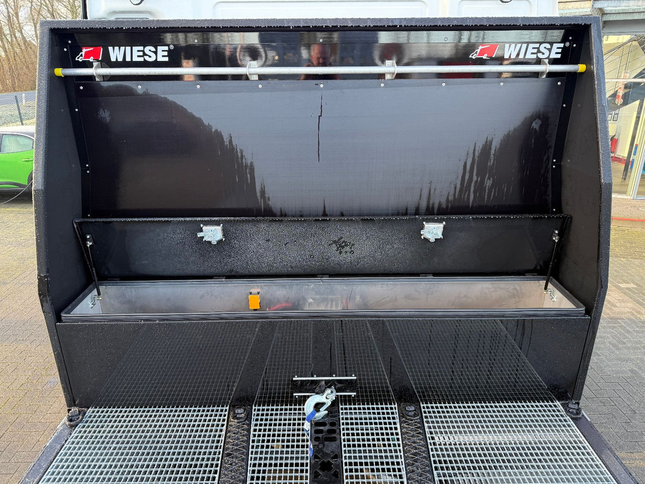 aus Gitterrostbodenmech. Verriegelung der Rampen incl. Halterung am Außenrahmen bei Nichtgebrauch (auf Wunsch Sicherung mit Gurten)