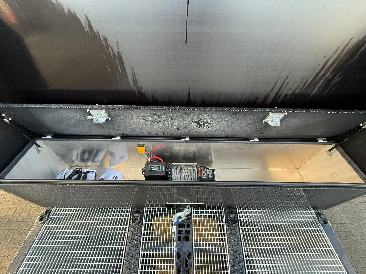 - 2 Stück Edelstahlstaukisten seitlich am Rahmen für Zurrmaterial (1 x links, 1 rechts)- 1 Stück Edelstahlstaukiste hinten rechts (für Hydraulikaggregat und Steuerblock)
