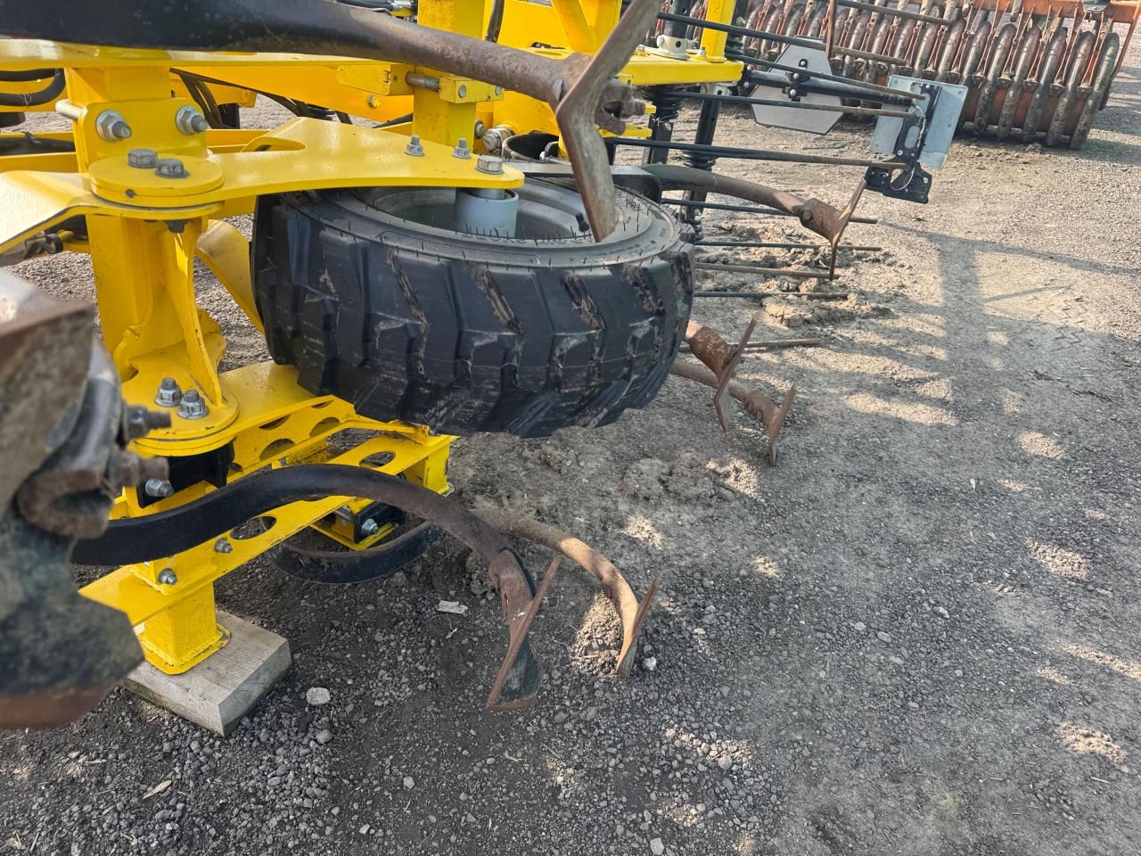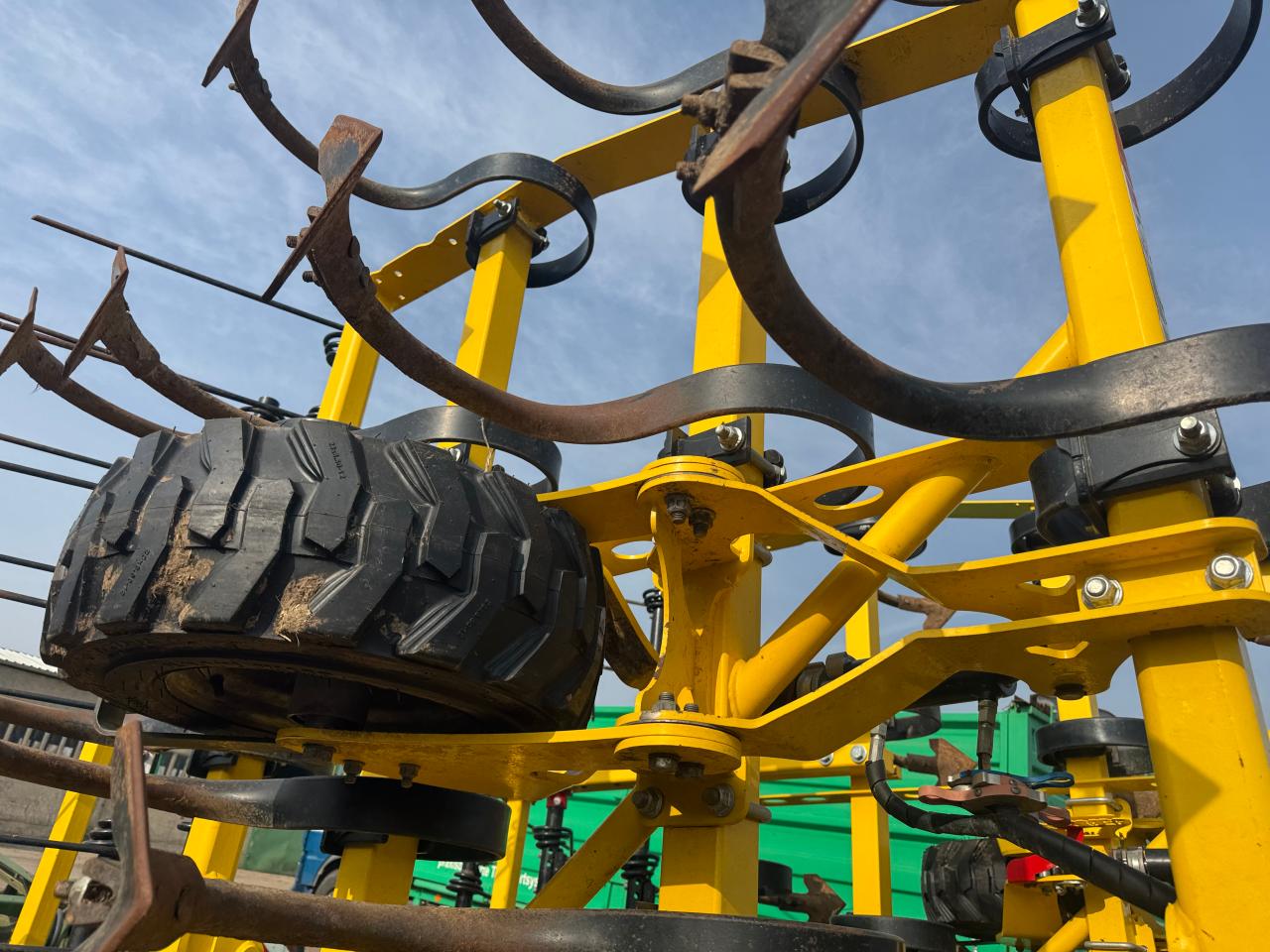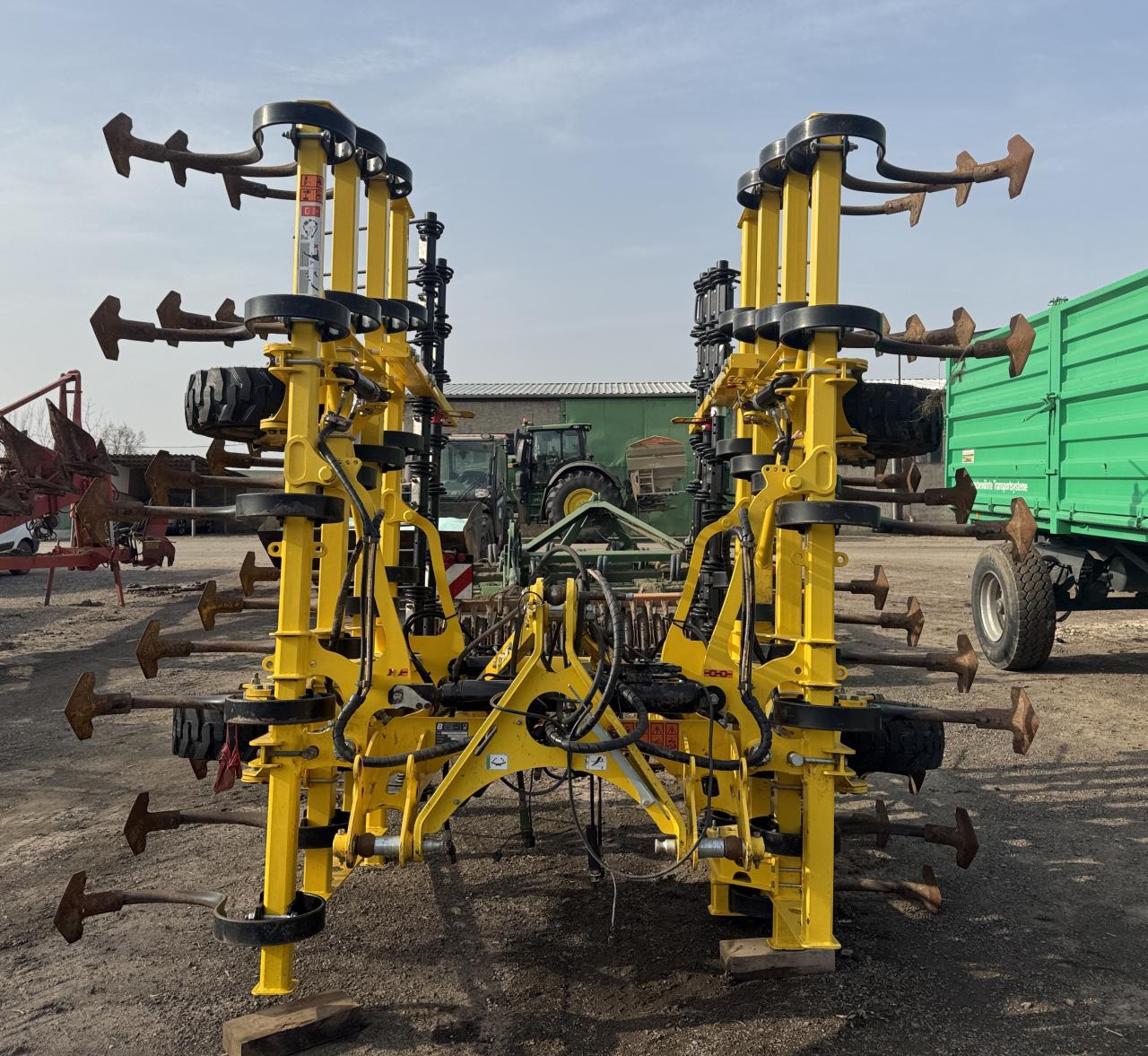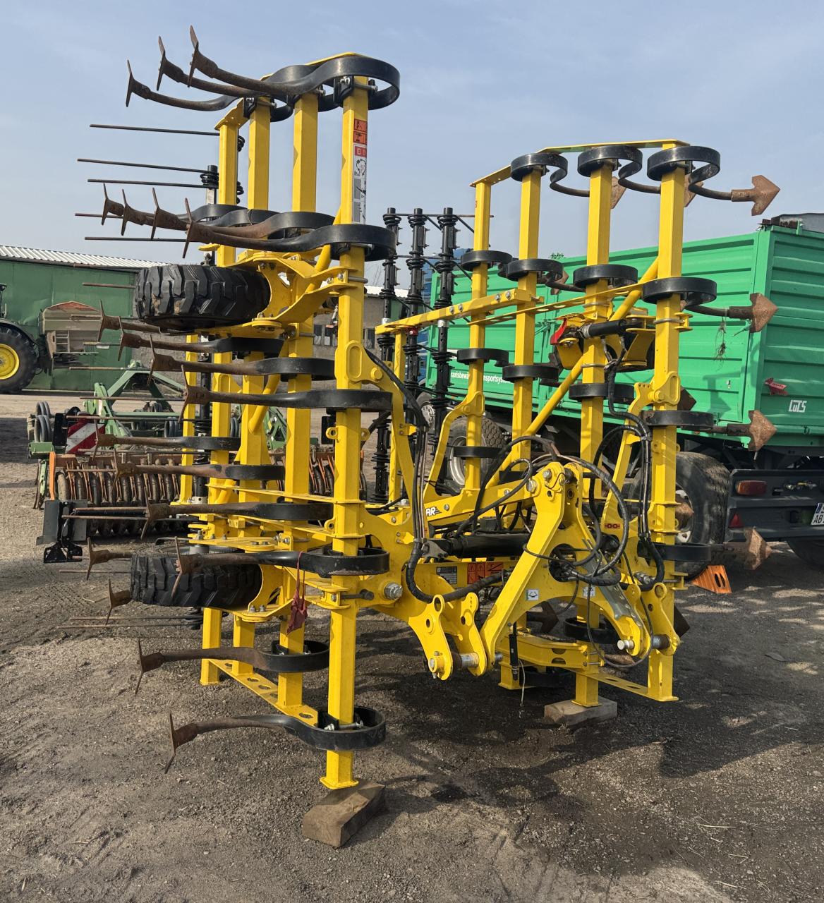 Arbeitsbreite 4 30 m Transportbreite 3 00 m hydraulisch klappbar 180 über Scherenklappung Klappung der Seitenteile mit 2 doppelwirkende Zylindern die Seitenteile sind in Arbeitsstellung hydraulisch eingespannt Mittelteil 3 00 m Seitenteile 2 x 0 65 m stabiler Rahmen aus Vierkantrohr 100x100 3 1 2 balkig ein Zinken ist zwischen den Unterlenkern ange ...