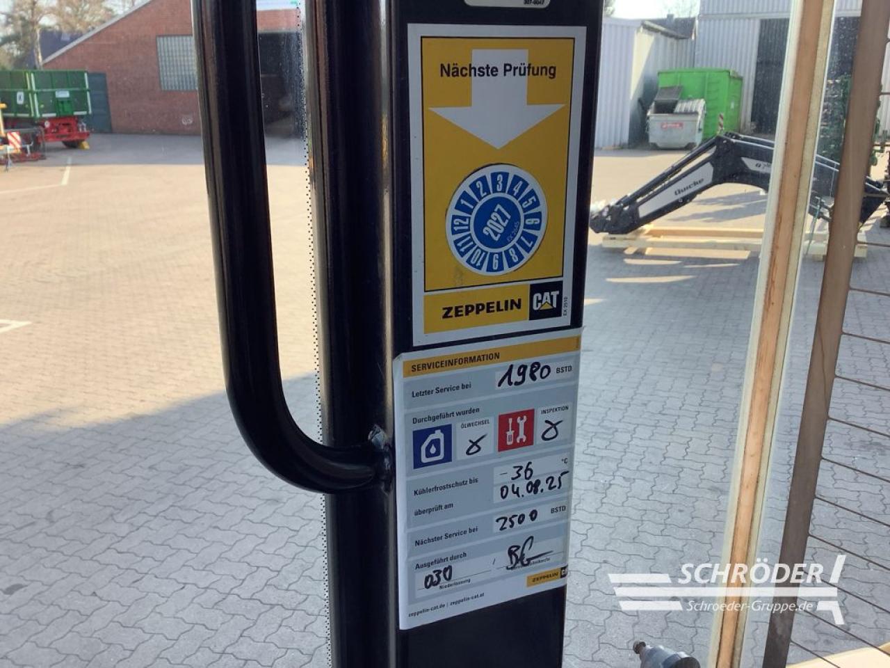 Einsatzgewicht: ca. 5.600 kg (ausrüstungsabhängig, CAT-Vierzylinder-Dieselmotor, Typ C3.3B DIT (wassergekühlt), EU-Abgasstufe V durch DPF und DOC (passive Regenerierung, Turbolader und Ladeluftkühlung, Hubraum: 3,3 l, Leistung: 55 kW / 75 PS nach ISO 14396, hydrostatischer Antrieb, drehzahl- und druckabhängige Lastverteilung zwischen Arbeiten und Fahren, Vorderachse starr, Allradantrieb, Planetenantriebe, zentral angeordnetes Knickpendelgelenk, Vorderachse: 100% Sperrdifferential (bis 6 km/h aktivierbar), Hinterachse: 100% Sperrdifferential (bis 6 km/h aktivierbar), Vorder- und Hinterachse in HD-Ausführung, Bereifung: 405/70 R18 SPT9 Dunlop, Knicklenkung (39 Grad), Wenderadius 4,40 m, Load Sensing-Lenkhydraulik, integriertes Notlenksystem, Betriebsbremse: Hydraulisch betätigte Scheibenbremse am Antriebsstrang, Feststellbremse: auf die Kardanwelle wirkende Scheibenbremse, Bremsinchpedal, 12 V wartungsfreie Batterie, Komplette Beleuchtungsanlage gemäß StVZO, Load-Sensing-Arbeitshydraulik, elektronische Ansteuerung der Ladeeinrichtung, Z-Kinematik mit Parallelhub, 3. Hydraulikkreis, ISO-Schnellwechsler, Joystick, inkl. FNR-Schalter, Druckknopf zur Aktivierung der Differenzialsperre und, proportionalem Schiebeschalter für Aktivierung der Zusatzhydraulik, Schallisolierte ROPS/FOPS-Basiskabine ohne Schiebefenster, Sonnenblende vorne, Umweltzeichen "Blauer Engel" (besonders lärm- und emissionsarm), Scheibenwaschanlage vorne/hinten, CAT-Kontursitz, Schalldruckpegel (innen)66 dB(A), , Schallleistungspegel (außen) 99 dB(A), Heizung inklusive Heckscheibenheizung, Radiovorbereitung (12V) inklusive Antenne, Kabel und Lautsprecher, verschließbare Staubox, 2x Halogen-Fahrscheinwerfer, 2x LED-Arbeitsscheinwerfer (vorne), 2x LED-Arbeitsscheinwerfer (hinten), elektronische Wegfahrsperre (Zahlencode), abschließbare Tankdeckel, Betriebsstundenzähler, Bergungsvorrichtung (abnehmbar), ECO-Mode, StVZ (Datenbestätigung + EG-Konformitätserklärung), Product Link PL240 (CAT Flottenmanagement); CAT Flottenmanagement, CAT Telematikbox PL240 , , , Garantieversicherung Zeppelin Longlife 12 Monate oder max. 500 Bh.