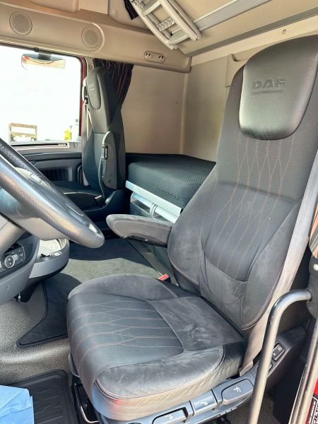 Super- Space- Cab Fahrerhaus 2 Liegen, Fahrerhaus Luftfederung, Fahrersitz Super- Air mit Leder-/ Alcantara- Bezug, Multifunktions- Lederlenkrad, elektrische Glas- Dachluke, Xtra Comfort Matratze untere Schlafliege, Kühlbox, Luxus- Lautsprechersystem, DAF Night-Lock, LED- Scheinwerfer, Nebelscheinwerfer, Kurven-/ Abbiegelicht, SKY-LIGHTS, Rückleuchten LED- Technik, Doppel- Drucklufthörner links und rechts, Standheizung mit Abwärmepumpe und Timer