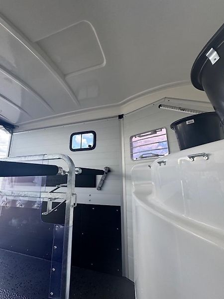 Abschließbare Sattelkammer mit ausziehbarem Sattelhalter, Trensenhalter, Spiegel, Netz, Innenbeleuchtung, Schaufel und Besen