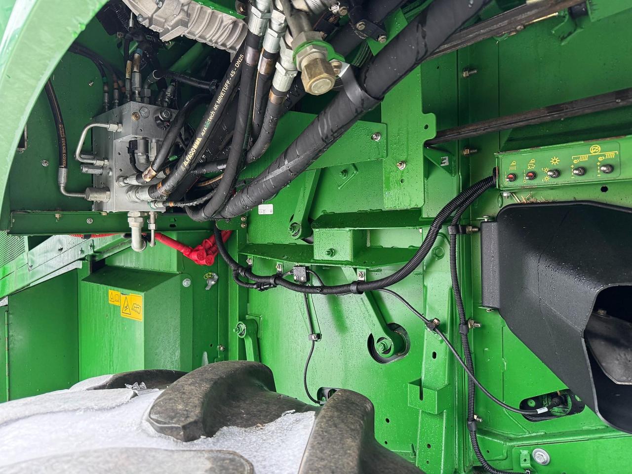 Xenon-Beleuchtungspaket und Leuchten zur Schnitthöhenkontrolle, Acht Scheinwerfer auf dem Kabinendach: Vier Xenon-Arbeitsscheinwerfer, sowie jeweils 2 Halogenscheinwerfer für Fern- und Abblendlicht, zusätzlich zwei Halogenscheinwerfer an unterem Kabinenrand;
