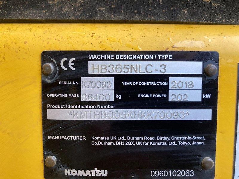 RADIO AM/FM UND VORBEREITUNG FÜR CD TUNNELABDECKUNG LAUFWERK AKUSTISCHER FAHRALARM BETANKUNGSPUMPE MIT ABSCHALTAUTOMATIK STANDARD-GEGENGEWICHT,TANKDECKEL UND MASCHINENABDECKUNG ABSCHLIEßBAR CE-KONFORMITÄTSERKLÄRUNG MONOBLOCKAUSLEGER HCU B 600 MM DREISTEG-BODENPLATTEN RAUPENBAGGER KOMATSU HB 365 NLC-3 6-ZYLINDER KOMATSU-MOTOR, 200 PS BETRIEBSGEWICHT: 36,3 TO. HYDROSTATISCHER FAHRANTRIEB MIT 3 AUT. FAHRSTUFEN,PLANETENUNTERSETZTEM ENDAN- TRIEB,HYDR.FAHR-UND FESTELLBREMSE HYDRAUMIND-HYDRAULIKSYSTEM UND ELEKTR. LOAD-SENSING IM GESCHLOSSENEN KREIS (E-CLSS),PUMPEN-U.MOTORREGELUNG (PEMC) HOCHAUFLÖSEND.MULTIFUNKTIONS-FARB-MONIT. MIT MASCHINENZUSTANDSÜBERWACHUNG(EMMS) 6-BETRIEBSARTEN WAHLSYSTEM: POWER-MODUS, ECONOMY-MODUS,HUB-MODUS,HAMMER-MODUS, ANBAUGERÄT-POWER-MODUS,ANBAUGERÄT-ECONOM MODUS,POWER-MAX,AUTOM.DREHZAHLRÜCKST. AUTOMATISCHE MOTORAUFWÄRMUNG EINSTELLBARE PPC HEBEL MIT BETÄTIGUNGS- TASTEN UND PPC BEDIENUNG FÜR STIEL, AUSLEGER,LÖFFEL U.DREHKRANZ NEUTRAL DETECTION SYSTEM(NDS),PPC HEBEL U.FUßPEDAL FÜR STEUERUNG U.FAHRANTRIEB VERSTÄRKTE SPACE CAB TM KABINE ROPS SCHUTZ MIT ÜBERDRUCK U.VIBRATIONS- GEDÄMPFTER KABINENLAGERUNG, GETÖNTE SICHERHEITSGLASSCHEIBEN,GROßES DACH- FENSTER MIT SONNENSCHUTZ,FRONTSCHEIBE MIT RASTSTELLUNG,HERAUSNEHMBARE UNTERE SCHEIBE,SCHEIBENWISCHER MIT INTERVALL- SCHALTUNG,SONNENSCHUTZROLLO 12V STROMANSCHLUß,GEPÄCKBOX,HANDLÄUFE FAHRERSITZ GRAMMER ACTIMO EVOLUTION KLIMAAUTOMATIK,KÜHL-U.WÄRMEFACH AUDIOEINGANG, KOMTRAX TM STUFE 5 INTEGRIERTE KOMTRAXANTENNE INDIVIDUELLE ERKENNUNG DES FAHRERS SICHERHEITSVENTIL AM AUSLEGER VORBEREITUNG FÜR HYDR.SCHNELLWECHSLER HOCHAUFLÖSENDE RÜCKSICHTKAMERA ÜBERLASTWARNEINRICHTUNG Schnellwechsler HS25 (LEHN) Tieflöffel 080CM MS21 (RESC)