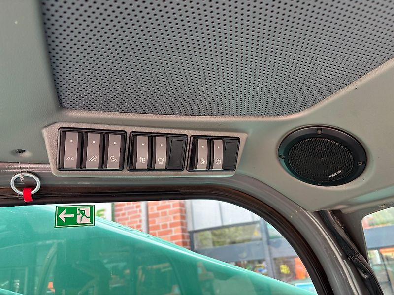 Fahrersitz luftgefedert, mit Radioanlage, verstellbare Lenksäule, Handyhalterung, Innenspiegel, Rundumleuchte, Scheibenwisch.- Waschanlage an der Scheibe rechts