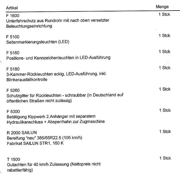 Achszahl 2 Aufbau Stahl Bereifung 650 55R26 5 BKT FLOTATION RADIAL Ladevolumen 30 50 zul Gesamtgewicht 24 Bordwandaufsatz abklappbar 1 Muldenlänge ca 7 000mm anstatt 5 200mm Ölbedarf 34 4l verstärkte Achsen und Federn empfohlen 1 Bordwandaufsatz Stahl 500mm rundum abklappbar und abnehmbar mit Sichtfenster vorn nicht getreidedicht 1 Sichtfenster mit ...