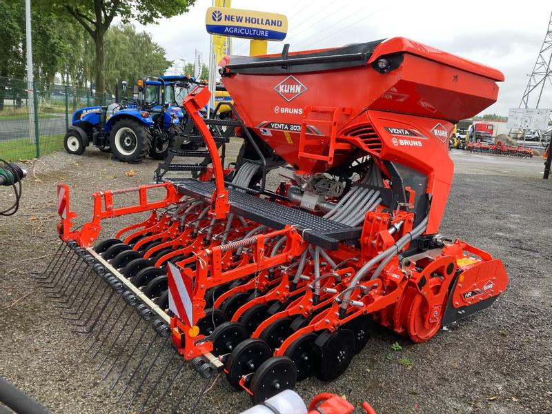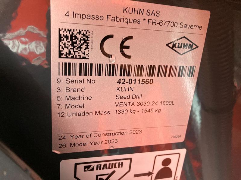 Fahrgestellnr.: 42011560, Kuhn pneumatische Aufbaudrillmaschine VENTA 3030-24 1800L ISOBUS, Load-Sensing Antrieb, CCI 800 + 9Pin Incab + RS232/Video, Saatstriegel 3 m, Warntafeln + Beleuchtung hinten, Elektrisches Fahrgassenschaltelement, 24x Abstreifer für Tiefenführungs- und Andruckrolle SEEDFLEX, ITH Power ISOBUS-Traktorbatterie-Kabel, Verbindungskabel Typ B, Halterung RAM C3.81 VESA 75, LED-Arbeitsscheinwerfer, Elektronische Waage, • Arbeitsbreite: 3,00 m, • Transportbreite: 3,00 m, • Erforderliche Hydraulikanschlüsse: 1 EW Steuergerät mit freiem Rücklauf, für den hydr. Gebläseantrieb, 1 DW Steuergerät für den hydr. Oberlenker, • Erforderliche Elektroanschl. am Traktor: 1 Elektroanschl. 25A für die, Stromversorgung der Drillmaschine, 1 siebenpolige Steckdose für die, • Behältervolumen: 1800 L, • Einfüllhöhe ca.: 213 cm, • Behälteröffnung ca: 240x135 cm, • Mögliche Fahrgassenrythmen: 12-15-18-21-24-27-30