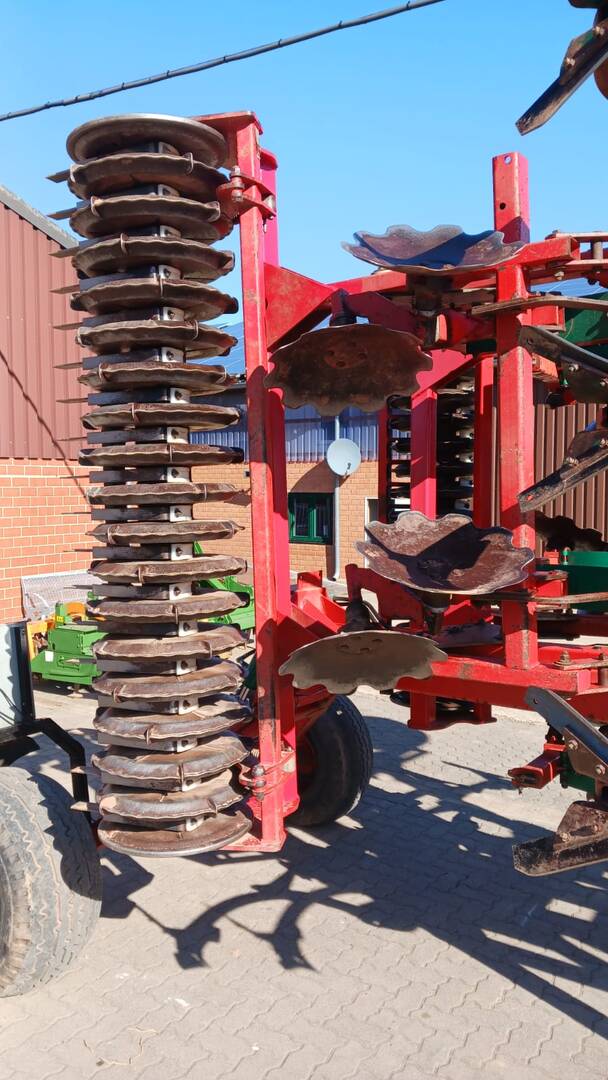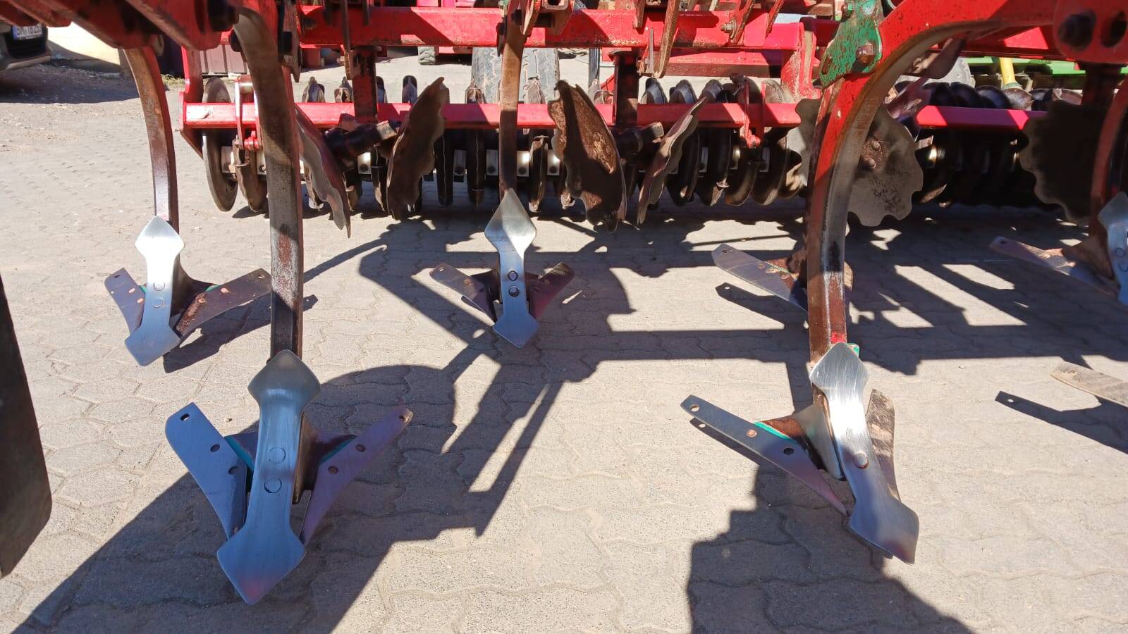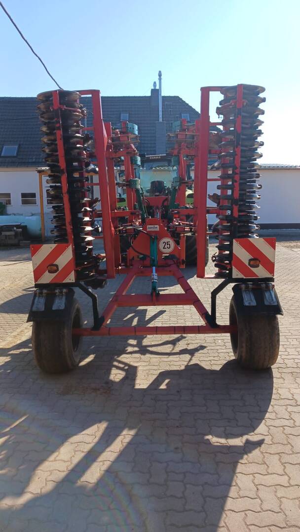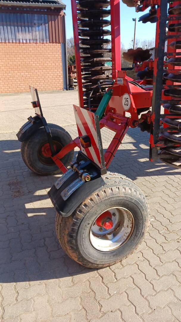 Auf Fahrwerk, 11 Zinken, Steinsicherung über Blattfeder, Doppelschare mit Flügel, 2 Stützräder, Stahlwalze, Beleuchtung.