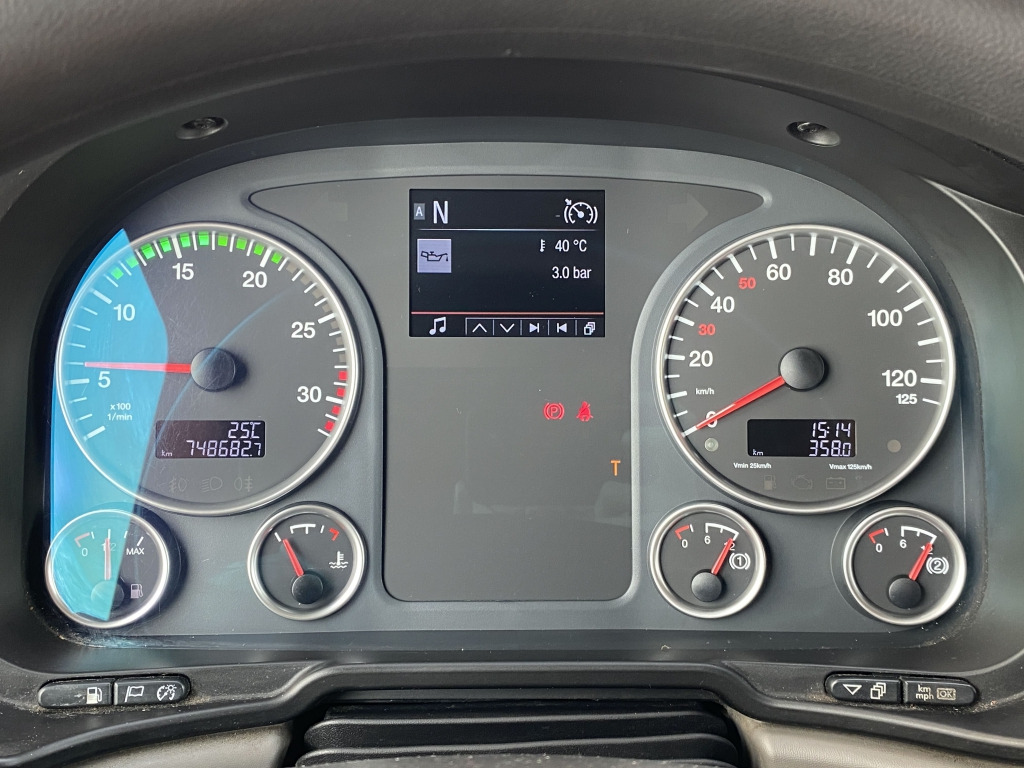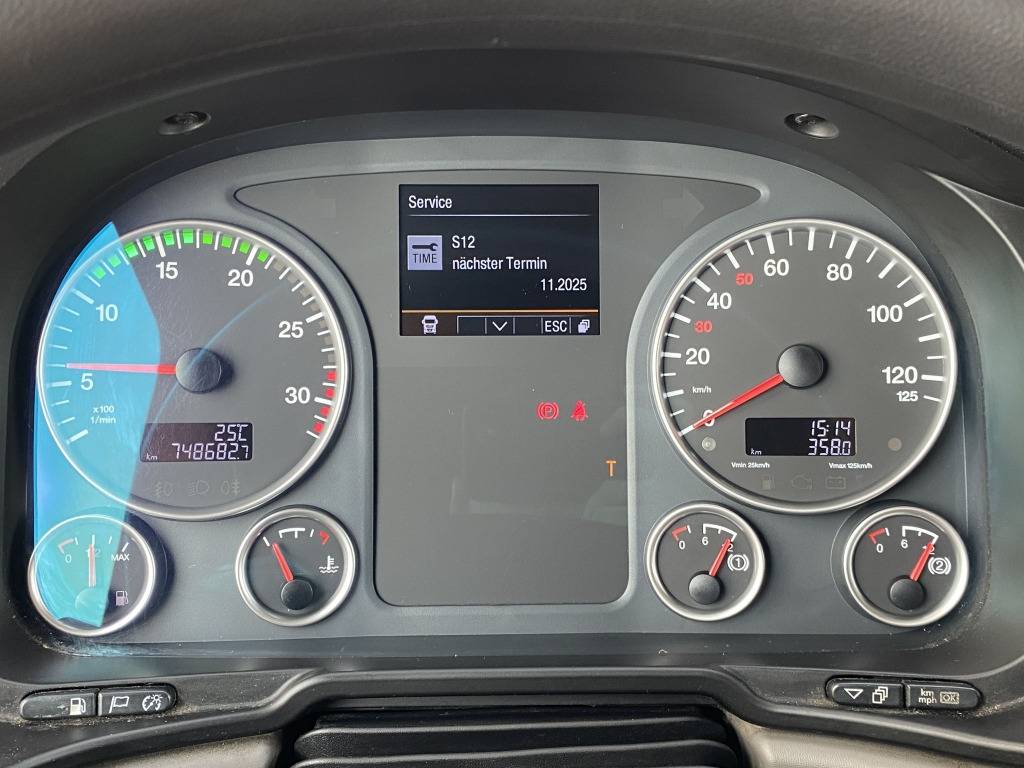 Der abgelesene Kilometerstand beträgt 748700. Die Leistung des Motors beträgt 250 PS. Das Fahrzeug besitzt 2 Achsen.