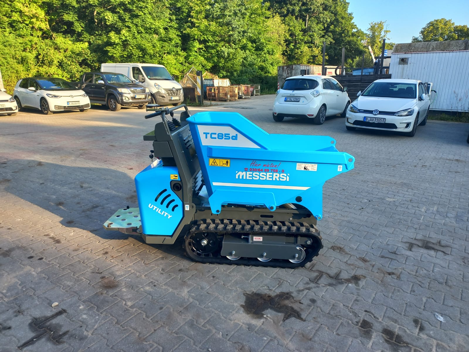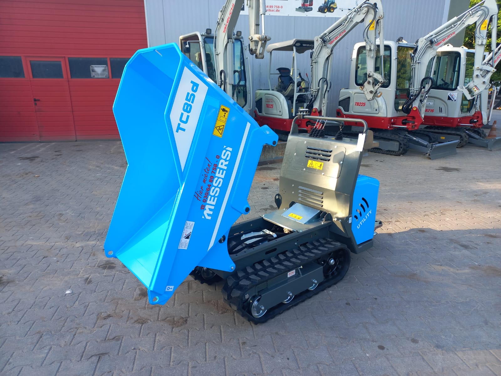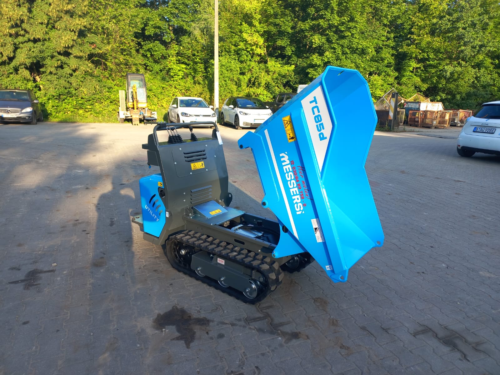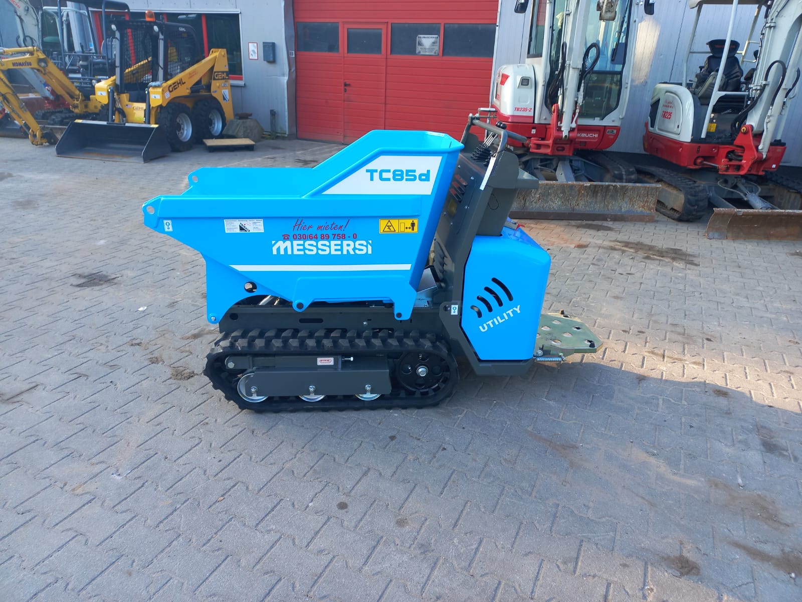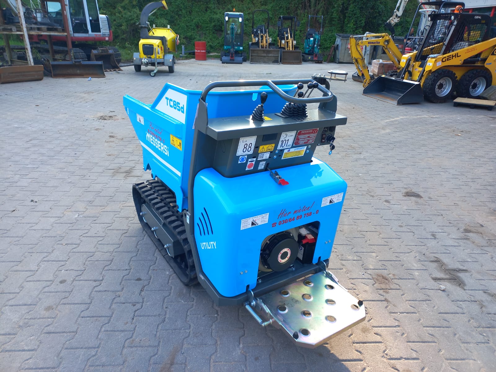 Dumper, Elektrostart, Trittbrett, luftgekühlter Yanmar-Dieselmotor L100N6 (7,4kW/10PS), 850kg Nutzlast, Muldeninhalt: gehäuft: 0,38m³ flach: 0,32m³ liquide Flüssigkeit: 0,12m³, Gummiketten 180mm breit, 2 Fahrgeschwindigkeiten: 0 - 2,1 und 0 - 4,2km/h, 3 Zahnradpumpen inkl. Kontergewicht