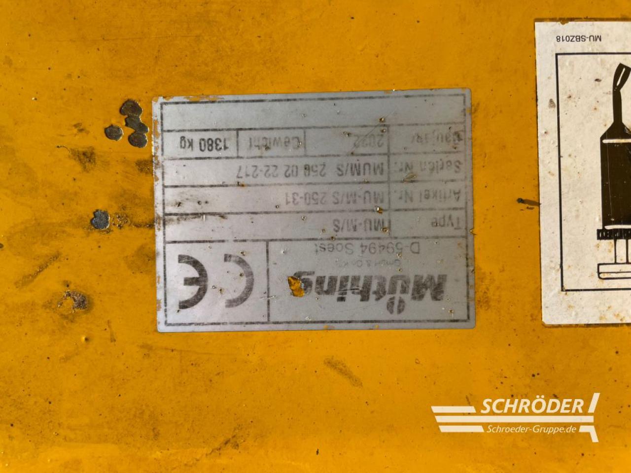 Seiten-Böschungsmulcher, Antriebsdrehzahl: 1.000 U/min, autom. Keilriemenspannung, hydr. Seitenverschiebung, hydr. Anfahrsicherung, eingebautes Kurzhäckselaggregat, Hammerschlegelrotor, selbstreinigende Stützwalze, geeignet für Traktoren bis 150 PS, Verschleißeinlage im Mulchkörper, Gelenkwelle GE 2502 beidseitig Weitwinkel, maschinenseitig 1 3/4 20-teilig,, schlepperseitig 1 3/8 6-teilig, Hinweis: Gebrauchtmaschinen verkaufen wir ausschließlich an Gewerbetreibende und ohne Garantie, Preis gilt für vorhandenen Zustand. Angebot freibleibend. Irrtümer und Zwischenverkauf vorbehalten.