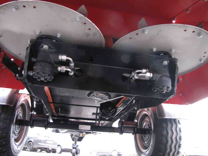 Zul. Gesamtgewicht 7100 kg, hydraulisch angetriebene Streuteller aus V2A mit Mengenregulierung und verstellbaren Flügeln, Streubreite 1,70 – 3,00 m, Schutzsieb oben im Behälter, hydraulisch angetriebenes Austrageband, 2 Kreis Druckluftanlage, 40 km/h-Ausführung, Maschinenlänge 5540 mm, Gewicht ca. 1600 kg, Bereifung 15/70-18, Abdeckplane, Beleuchtung.