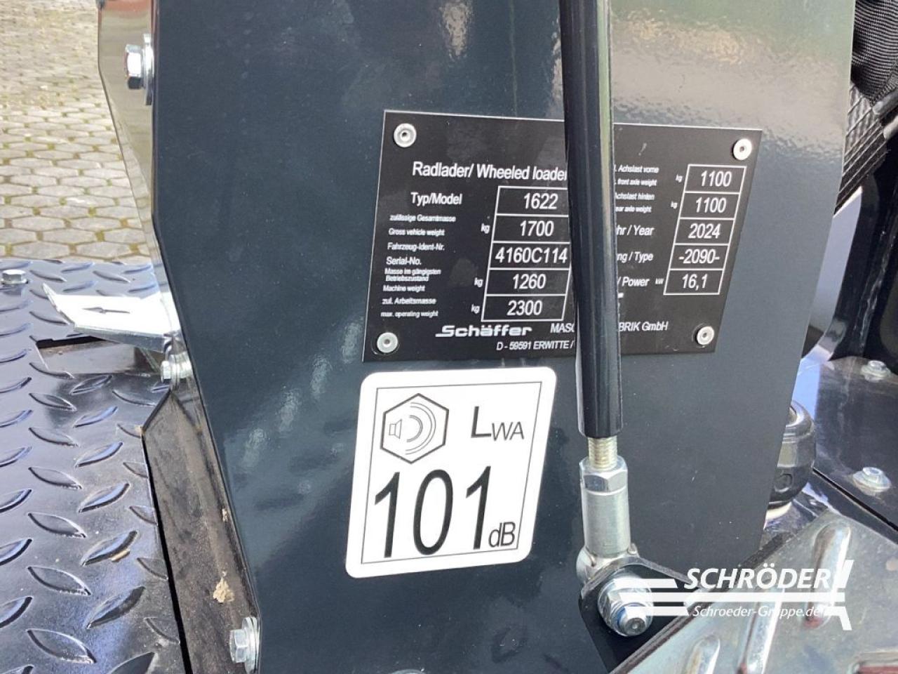 mit Fahrerschutzdach, , Technische Daten Schäffer 1622:, Leistung: 16,2 kW (22 PS), Betriebsgewicht: 1.250 kg, Geschwindigkeit: 16 km/h, Länge mit Standardschaufel: 3.050 mm, Breite: 890 - 1.060 mm, Höhe: 1.990 mm, Wenderadius: 970 mm, Hubhöhe (WZ-Drehpunkt): 2.230 mm, Hubkraft: 810 kg, Kipplast gerade (Palettengabel): 600 kg, Kipplast gerade (Schaufel): 800 kg, , Serienausstattung Schäffer 1622:, 3-Zylinder-Dieselmotor Kubota D902, hydrostatischer Allradantrieb mit Fahrpedal, Original Schäffer-Achsen, Kombi-Ölkühler, Trommelbremse als Feststellbremse, wartungsfreies Knick-Pendelgelenk, Rückhaltesystem (Fahrerschutzdach), 1 LED-Arbeitsscheinwerfer vorne auf Schwinge, Parallelführung, Zusatzsteuergerät mechanisch bedienbar, Arbeitshydraulik: 28 l/min, einstellbare Lenksäule, Betriebsstundenzähler, Tank- und Temperaturanzeiger, mechanisches Handgas, Sitzkontaktschalter, Schnellwechselrahmen SWM, Sonderausstattung:, , First Edition Ausstattung, bestehend aus:, druckloser Rücklauf, Feststellraste mechanisch für Zusatzsteuergerät, Komfortsitz MSG 65,, LED-Arbeitsscheinwerfersatz 800 Lumen, Abschleppvorrichtung mit Bolzen und Zurrösen, Serienbereifung: 23x8.50-12 AS, ET 60, Aufnahmerahmen Hoflader-WS Typ SWH hydraulisch