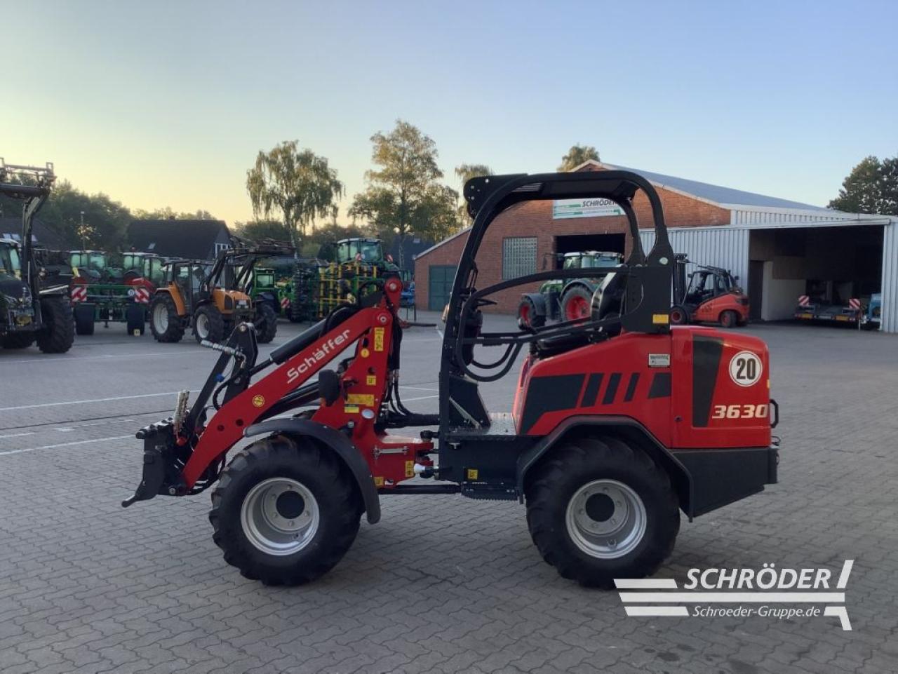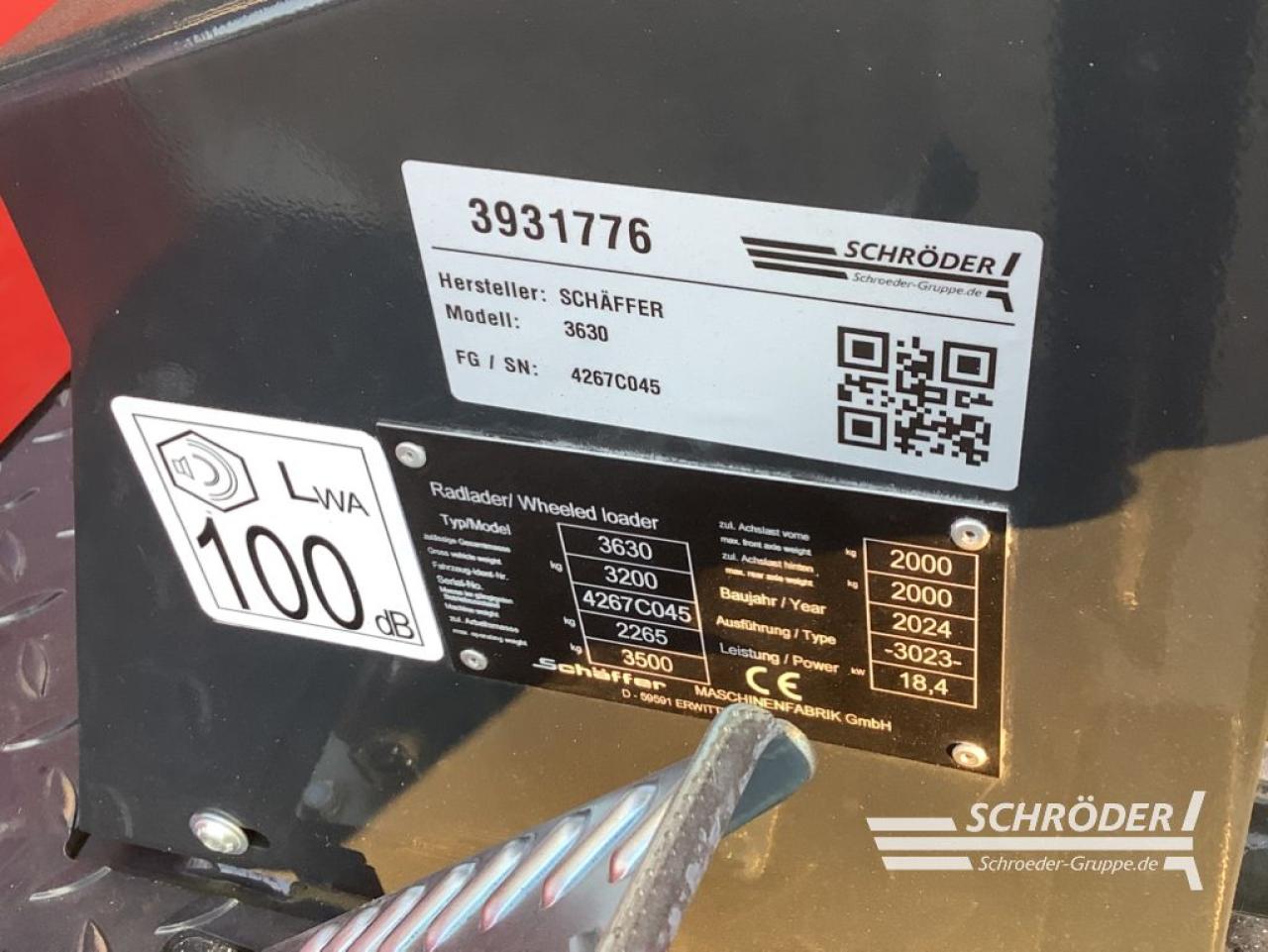 Technische Daten Schäffer 3630:, Leistung: 18,5 kW (25 PS), Betriebsgewicht: 2.300 kg, Geschwindigkeit: 20 km/h, Länge mit Standardschaufel: 4.110 mm, Breite: 1.200 - 1.370 mm, Höhe: 2.230 mm, Wenderadius: 1.020 mm, Hubhöhe (WZ-Drehpunkt): 2.880 mm, optional 3.110 mm, Hubkraft: 1.700 kg, Kipplast gerade (Palettengabel): 1.148 – 1.421 kg, Kipplast gerade (Schaufel): 1.495 – 1.817 kg, , Serienausstattung Schäffer 3630:, 3-Zylinder-Dieselmotor Kubota D1703-M Di, hydrostatischer Allradantrieb mit Gelenkwelle und automotiver Steuerung, Hochdruck-Antrieb HD-plus, HTF (High Traction Force), SPT (Schäffer Power Transmission), hydraulischer Schnellgang 20 km/h , Original Schäffer-Achsen, Kombi-Ölkühler, wartungs- und verschleißfreie Lamellenbremse im Ölbad als Betriebs- und Feststellbremse, wartungsfreies Knick-Pendelgelenk, Rückhaltesystem (Fahrerschutzdach), 1x LED-Arbeitsscheinwerfer vorne auf Schwinge, Parallelführung, Zusatzsteuergerät mechanisch bedienbar, Arbeitshydraulik Serie 37 l/min, optional 42 l/min., einstellbare Lenksäule, Betriebsstundenzähler, Tank- und Temperaturanzeiger, Heckgewicht-Endplatte, Sitzkontaktschalter, Schnellwechselrahmen SWH mit hydraulischer Verriegelung, Zusatzausstattung:, , Hinterwagen mit verbreiterten Kotflügeln, ROPS-Fahrerschutzdach, Koffergewicht 95 kg, druckloser Rücklauf, Zahnradpumpe verstärkt 19 ccm, Feststellraste elektrisch für Zusatzsteuergerät, Zusatzsteuergerät elektrisch, Ausführung ELPRO, elektrisch oder proportional über heben/senken, Belechtungsanlage, TÜV-Gutachten Arbeitsmaschine selbstfahrend <25 km/h, LED-Arbeitsscheinwerfersatz 800 Lumen (2x vorne und 1x hinten), Batterie-Hauptschalter, Abschleppvorrichtung mit Bolzen und Zurrösen, Bereifung: 31x15.5-15 AS 6-Loch, ET -70, Aufnahmenrahmen Euro-WS, hydraulische Verriegelung