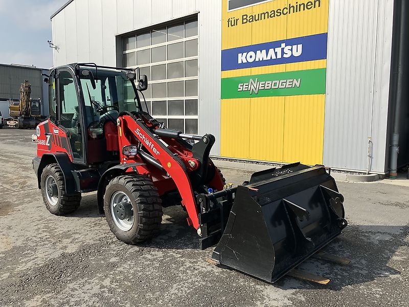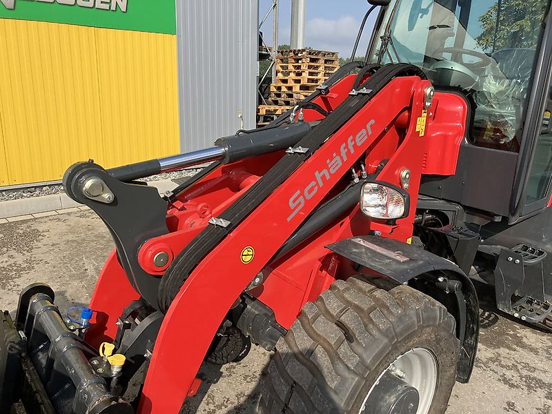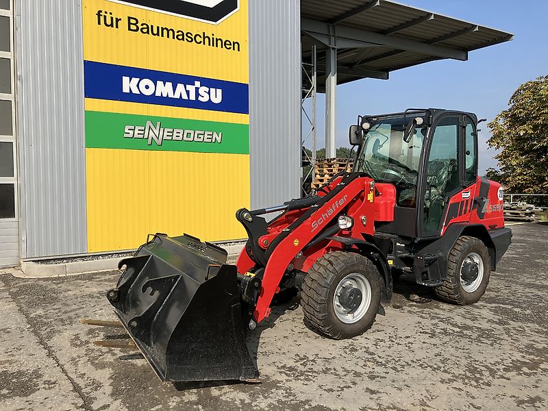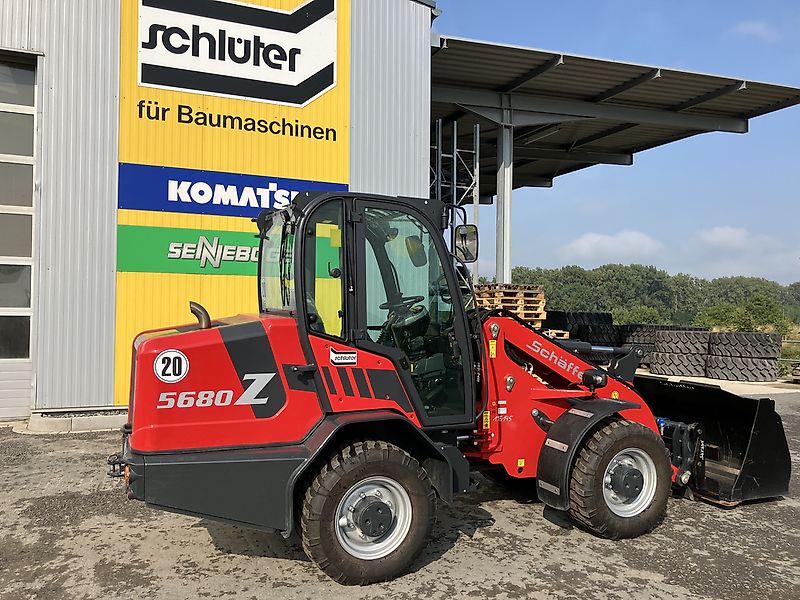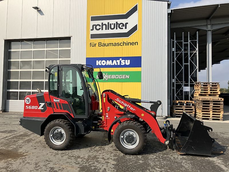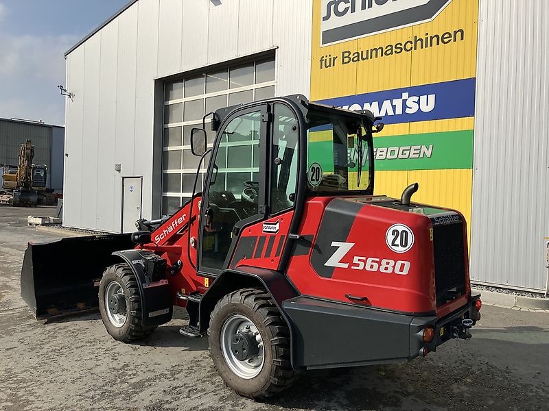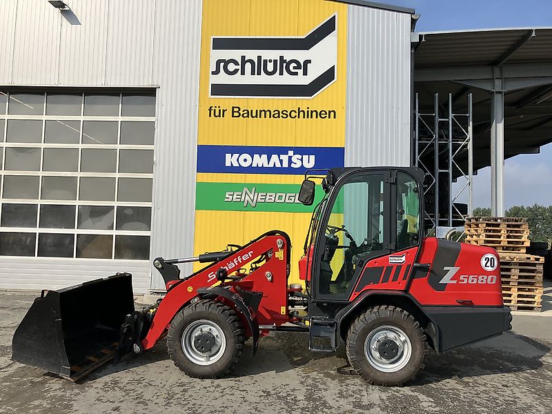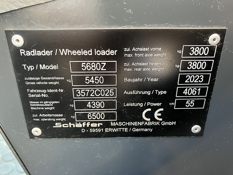 RADLADER SCHÄFFER 5680 Z 4-ZYLINDER DEUTZ-MOTOR, 61 PS BETRIEBSGEWICHT: 4,4 TO. SICHERHEITS-FAHRERHAUS (ROPS) STANDARD HUBGERÜST 3-FACH STEUERUNG ARBEITSBELEUCHTUNG RADIO MULTIFUNKTIONSHEBEL BEREIFUNG 15.5/55 R18 ALLIANCE 0,98 CBM SCHAUFEL, 1.800 MM PALETTENGABEL