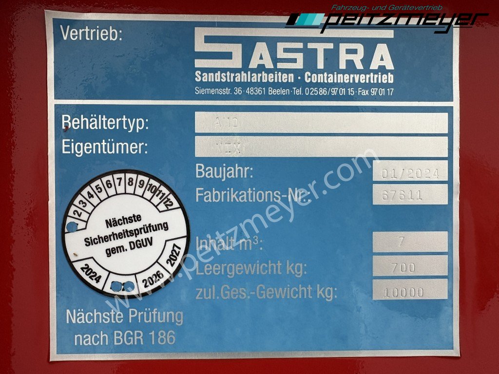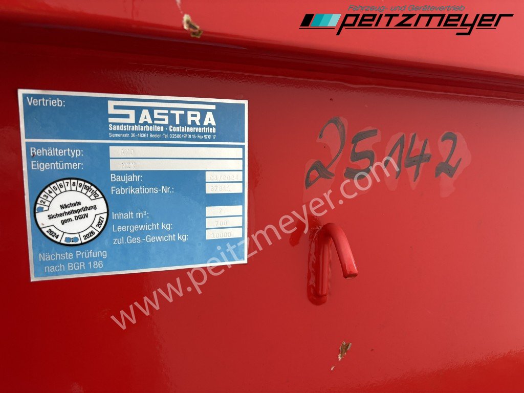 Aufbautyp: Absetzmulde Sastra - AM 0, Inhalt: ca. 7 m³, Asymmetrische Form mit Einfach-Kipplager an der Schüttkante, Aufnahmebeschläge für Absetzsystem nach DIN 30720, Boden 6 mm, Seiten 4 mm, alle Ecken verstärkt, Netz- und Planhaken umlaufend, mehrfach vorhanden - auch mit Klappe