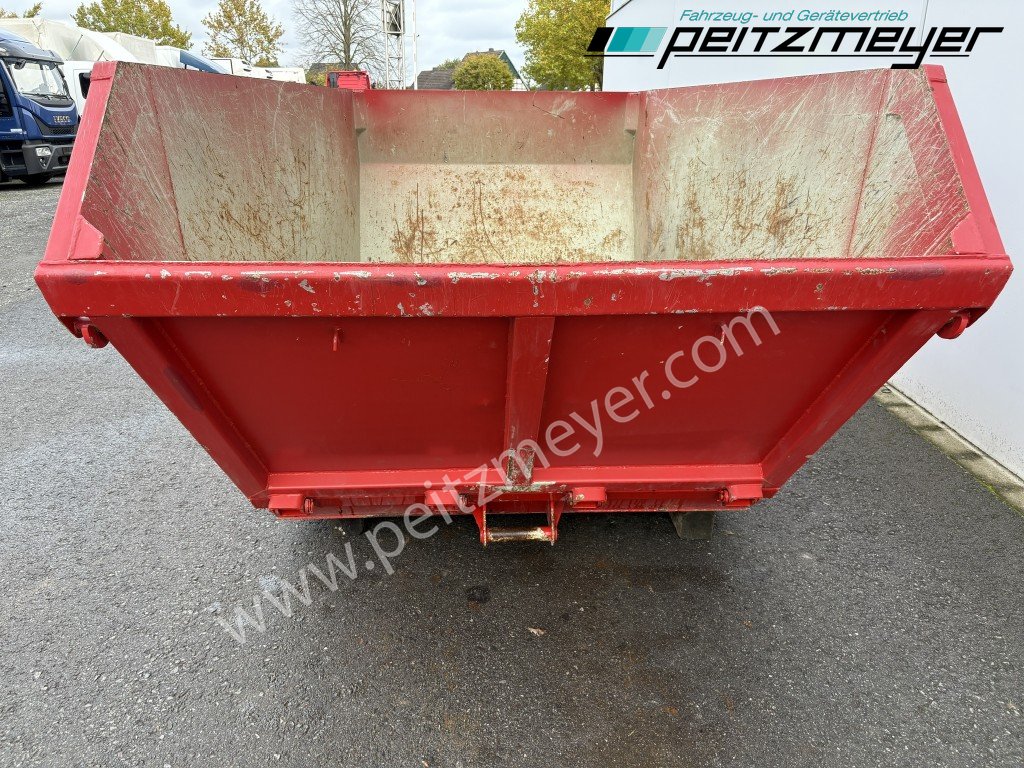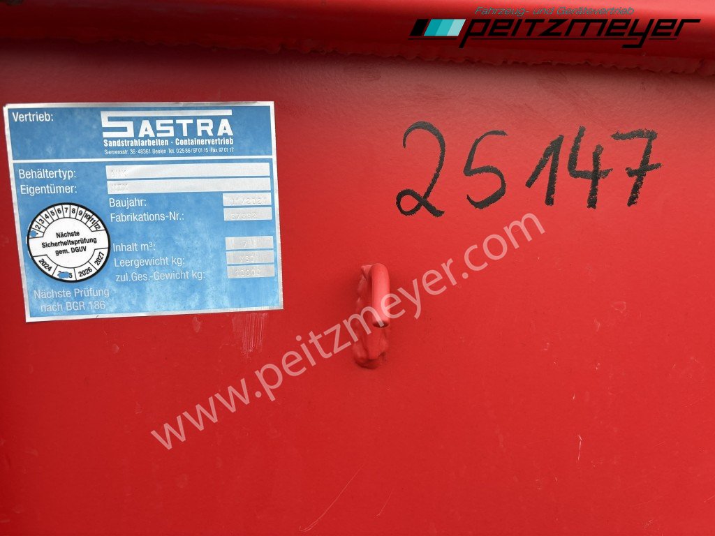Aufbautyp: Absetzmulde Sastra - AMK, Inhalt: ca. 7 m³, Asymmetrische Form mit Einfach-Kipplager an der Schüttkante, Aufnahmebeschläge für Absetzsystem nach DIN 30720, Boden 6 mm, Seiten 4 mm, alle Ecken verstärkt, Netz- und Planhaken umlaufend, mehrfach vorhanden - auch ohne Klappe