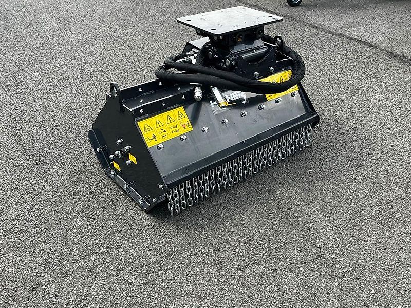 Mulcher/Schlegelmulcher HSM800 Neugerät Baggerklasse: 1,5- 4 ton Öldurchfluss: 30-50 l/min Betriebsdruck: 170-200 bar max. Größe Schläuche: 1/2 Zoll aussengewinde Gewicht: ca.110 kg Länge: 940 mm Breite: 670 mm Höhe: 610 mm Arbeitsbreite: 800 mm Mat.Stärke Grundkörper: 4mm Mat.Stärke Seitenteile: 5mm Schlegelanzahl: 12 max.Ø Mulchgut: 20-30mm min. Schnitthöhe: 30mm Antrieb: Hydraulisch/Keilriemen mit höhenverstellbarer Laufrolle Kranhaken Motorabdeckung