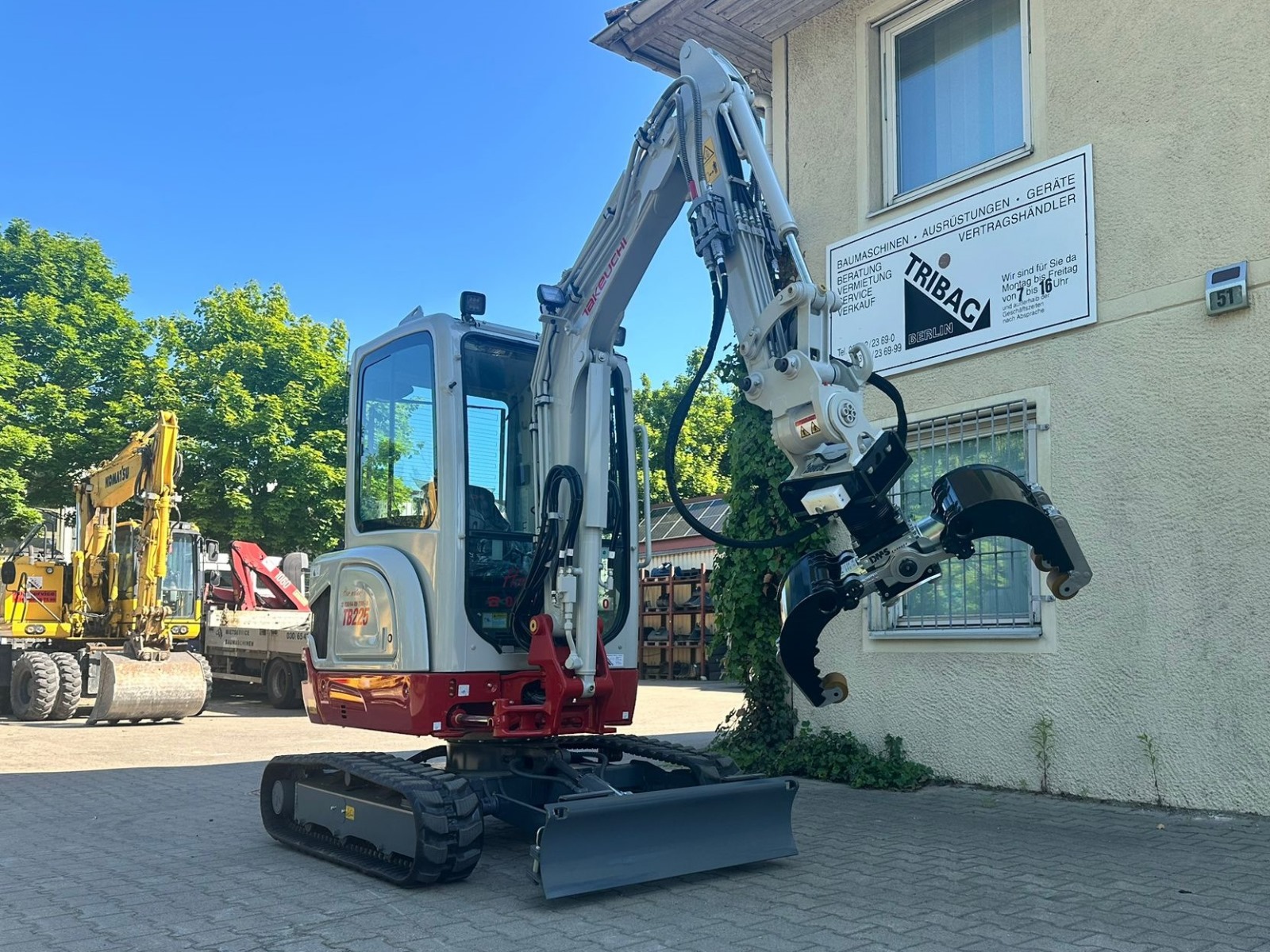 V4, Powertilt, hydr. Schnellwechsel Lehnhoff HS03, elektr. Greiferumschaltung, Taklock, Tieflöffel mit Schraubzähnen, Grabenräumwanne starr 1200mm